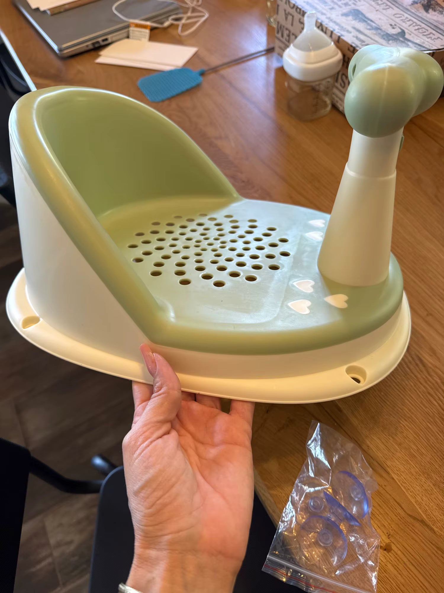 Very convenient seat for baby shower, comfortable rubber seat, front stand, the child cannot fall! Very satisfied! !Delivered with suction cups to prevent it from moving! !
